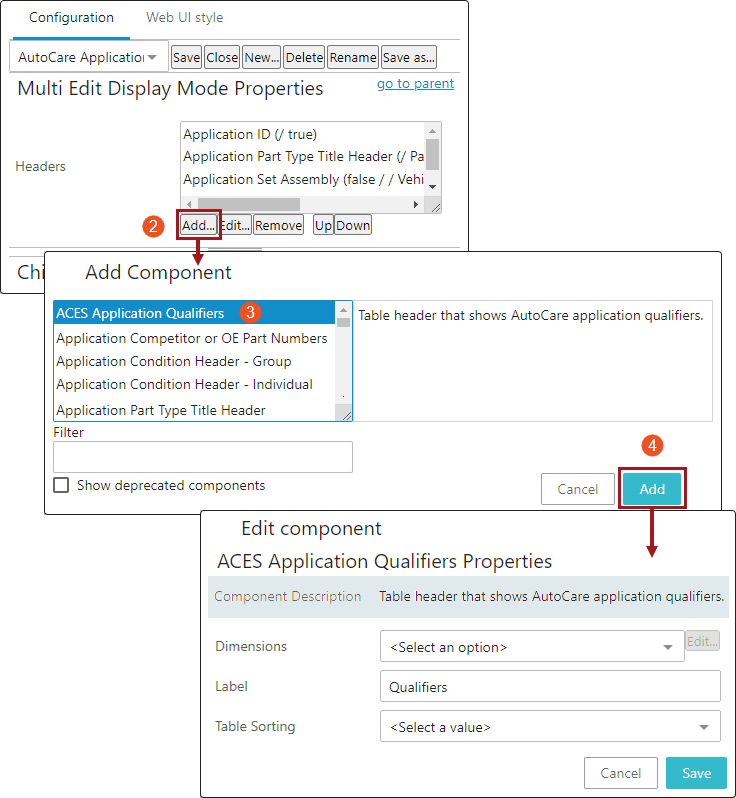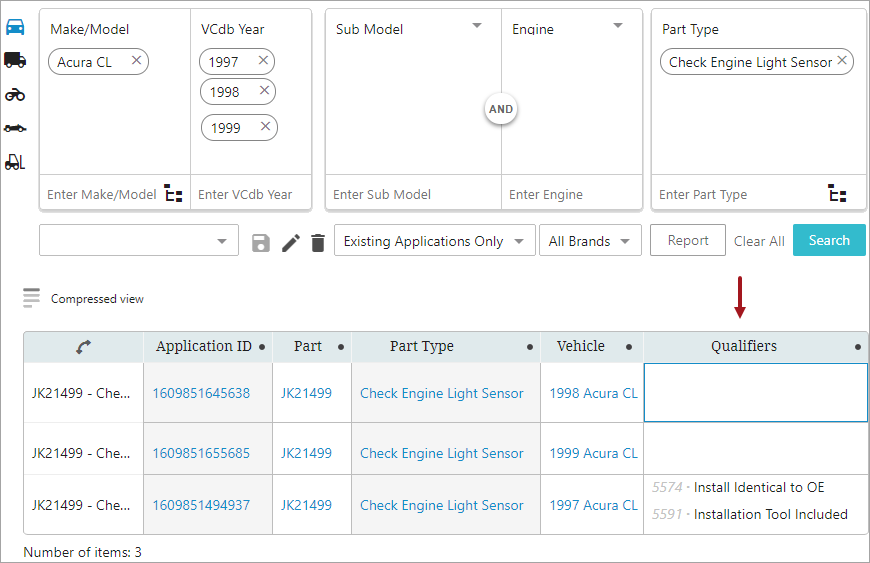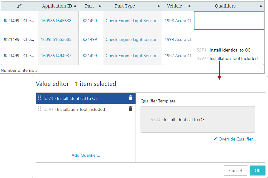 The ACES Application Qualifier table header component displays the AutoCare application qualifier within the AutoCare Application Manager Results Table and/or Application Editor Screen. The applicable qualifiers are listed in a column against each result. Further, users can double click on the cell to open up the Value Editor window and can add, delete, and override the qualifiers.