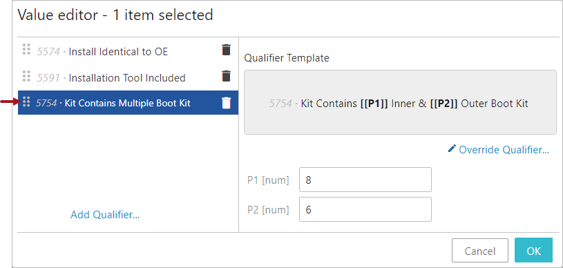 In the example screenshot below, the qualifier template 'Kit Contains [[P1]] Inner & [[P2]] Outer Boot Kit' has two parameters P1 and P2. Adding the values of numeric '8' and '6' in parameters P1 and P2, respectively, has lead to the display of qualifier text 'Kit Contains 8 Inner & 6 Outer Boot Kit' in the left column.