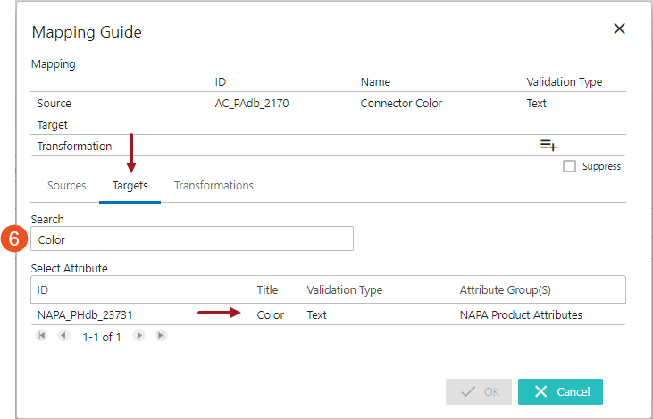 - With the Targets tab selected, click in the Search field and start typing the initial letters of the attribute name or ID. This searches for the attribute from the Target object where the retrieved value should be copied to. Select the attribute from the result list displayed below the search bar.