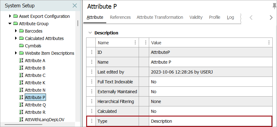 - In System Setup, expand Attribute Groups node, expand the relevant attribute group, and then select the relevant attribute. The Attribute Editor appears.