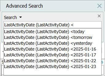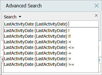 On the Advanced Search tab, in the Search field, add the ID of the last activity attribute, add a space, and select an operator.