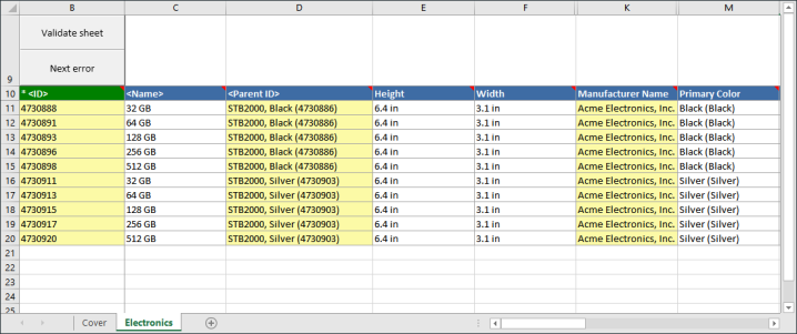 Note: In order to support this, the object type must be mapped in the export configuration. If importing new products, this column must be populated with the desired object type for all products. Additionally, the configuration can contain a mapping for Parent ID which displays in the downloaded sheet as a column with a selector dialog so that end users select from valid parent objects.