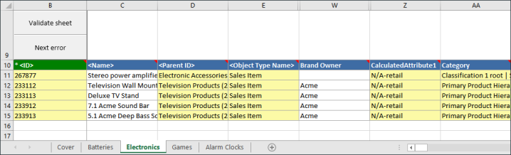 Multi-object Smartsheets handle multiple mutually independent object types in the same Excel workbook. For each product category selected for download, a sheet will be added to the Excel workbook. Each sheet can contain all configured object types alongside each other.