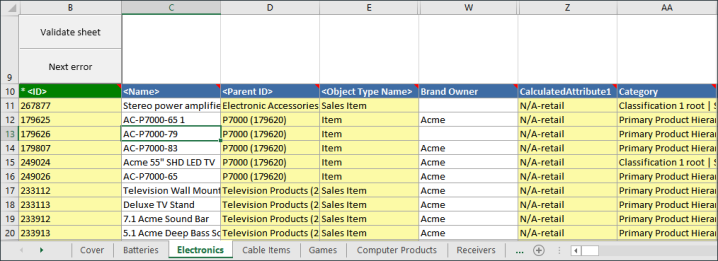 For each product category selected for download, a sheet will be added to the Excel workbook. The sheets are based on where attributes are linked within the product hierarchy. For more information on attribute links, refer to the Attribute Links topic in System Setup documentation.
