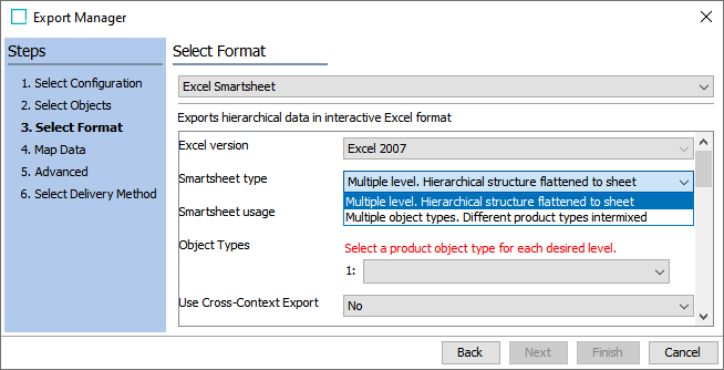 When creating a Smartsheet export, users can choose between two Smartsheet types: Multiple level and Multiple object types.