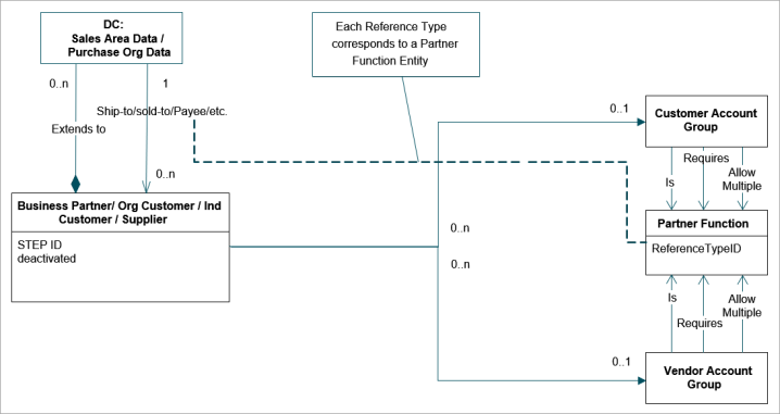 A Customer has exactly one Customer Account Group and a Supplier has exactly one Vendor Account Group. An account group has one-to-many valid partner functions. Not all customers and vendors can act in all partner functions.