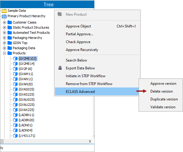 The deletion process eliminates all ECLASS Advanced data, including referenced Product Blocks and Product Aspects along with their immediate parent nodes. In addition, the Application Class reference is also removed for the selected version(s). The values associated with the actual SKU/Product remain unchanged.