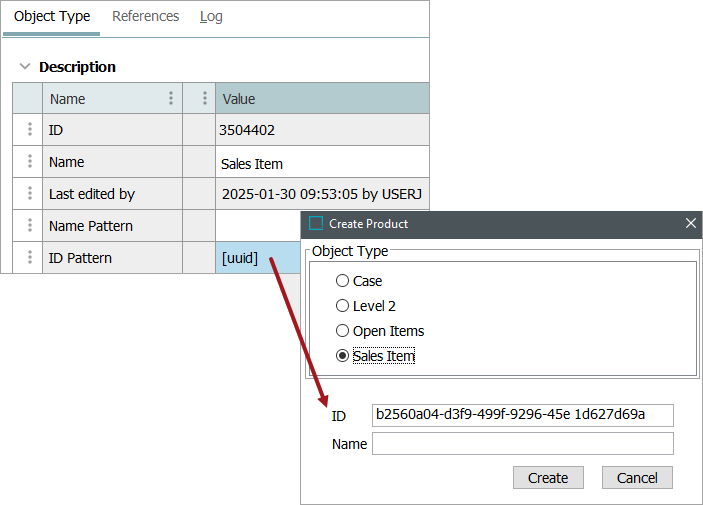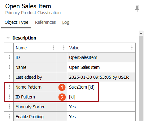 To specify an ID / Name Pattern, select the object type in system setup below the 'Object Types and Structures' node and enter the desired pattern in the field ‘ID Pattern’ or ‘Name Pattern’ parameter. As illustrated below, a new node of the object type 'Product' has a pattern of 'SalesItem [id]' for the Name Pattern parameter and [id] for the ID Pattern field.