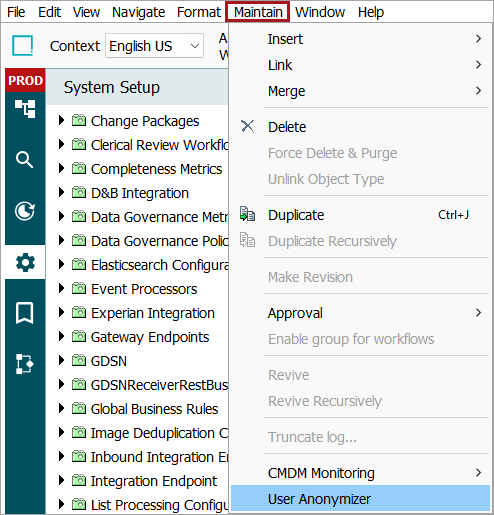 In the workbench Tree, go to the Maintain menu and select User Anonymizer.