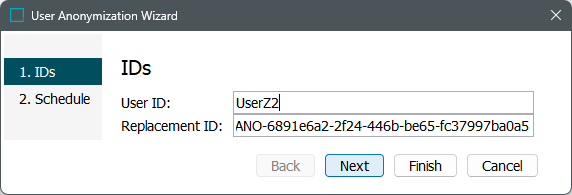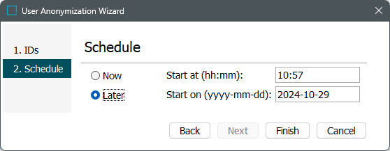 Now is the default setting and runs the process when you click Finish on the User Anonymization Wizard.