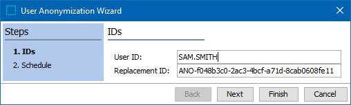 The admin user running the User Anonymizer process enters ‘SAM.SMITH’ in the ID field and clicks Next.