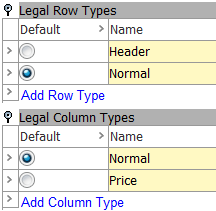 - The table type has at least one legal column type and one legal row type. If the table type uses more than one row type or column type, a default type must be specified for each.