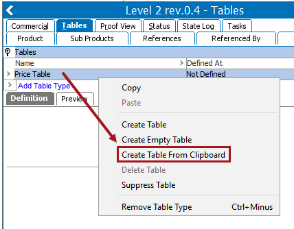 - The content from the clipboard is pasted into the table. The row types and column types are those set as the default row and column type on the table type.