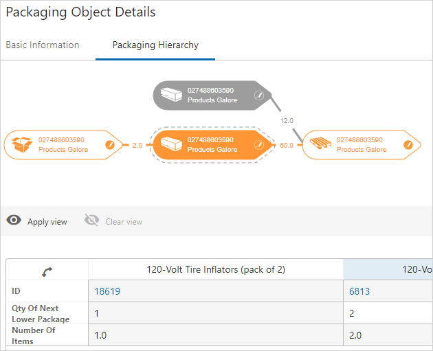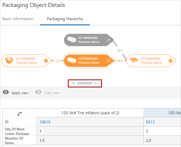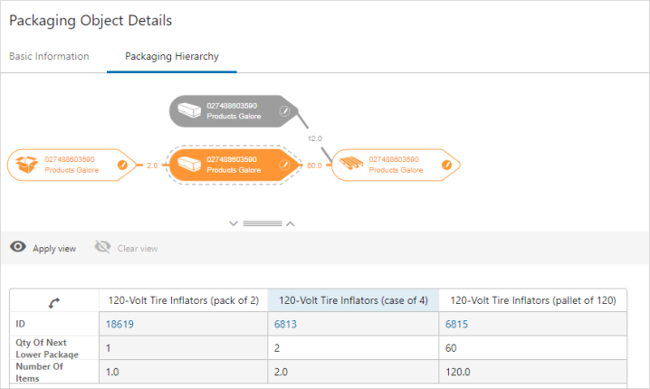 To select a particular packaging type in the hierarchy, click on the icon in the graphic and the selected packaging type will be highlighted in both the graphical view and in the table.