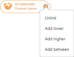 - To create a packaging hierarchy for the selected item or to create an additional hierarchy for the item, the user can click on the edit button on the right side of the icon and select the configured actions. In the example, available actions are: Add lower level, Add higher level, Add between level, or Unlink.