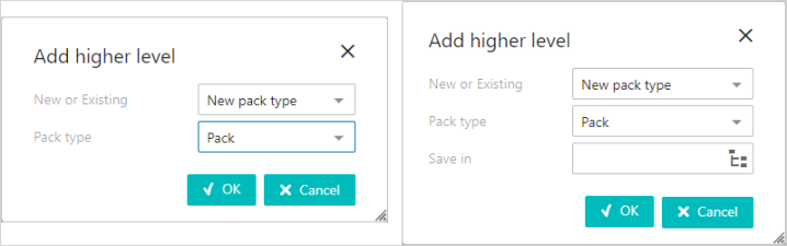- When adding a level, a dialog box with the available packaging types will appear. It is only possible to select the valid packaging types that have been set up in the workbench and in accordance with the references between the packaging types. If a new pack type is chosen, then it is possible to select the Packaging Product Folders folder / folders by using 'Save in' (either by dropdown selection or Node Picker - depending on the configuration set up for Packaging Properties).