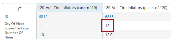 To edit the quantity (of next lower level package) attribute, click on the associated cell in the row / column. It will then be possible to change any existing value or enter a new value for that cell. Remember to save any changes. Any updated or added values will be changed in the graphical view and Number Of Items will recalculate based on the new quantity.
