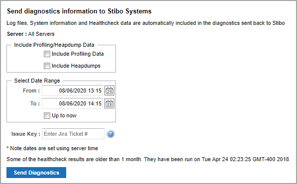 Important: Anytime an issue is sent to Stibo Systems Support regarding general system troubleshooting, performance issues, or for assistance resolving problems detected via healthchecks, a diagnostics package should also be sent to Stibo Systems to ensure that the proper information is captured and reported at the time when the issue is occurring.