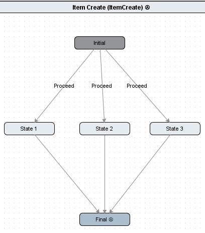 In the following example workflow, there are the 'Proceed' transitions, each going to a different state. When the user selects to Proceed, the transitions are evaluated in the following order: Proceed (State 1), Proceed (State 2), and Proceed (State 3). Each transition is evaluated until one is found that passes the transition conditions.