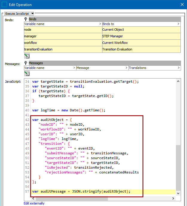 The following screenshot shows a portion of the JavaScript code for the out-of-the-box Workflow Audit Action business action. The highlighted section of the code is what builds the JSON object that is sent as the audit message. The JSON message is received and handled by the plugin associated with a specific topic; in this case, the Audit Message Receiver JDBC database delivery plugin.