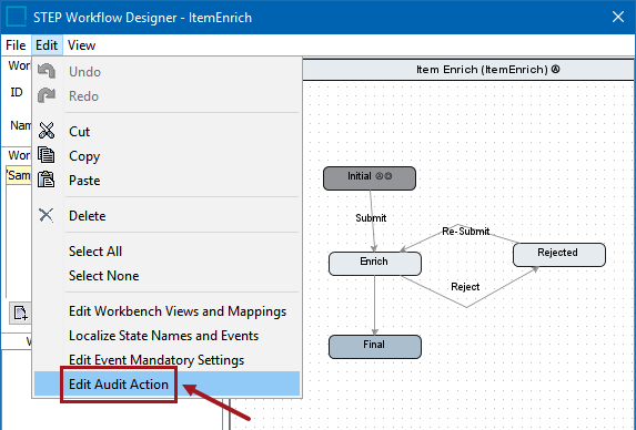 - In the STEP Workflow Designer, click Edit > Edit Audit Action.
