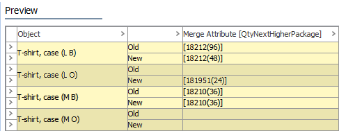 - Setting the operation parameters as 'Qty of Next Lower Package' for the source, 'Qty of Next Higher Package' for the target, using the Overwrite existing values, and setting Merge Link Attribute = Yes results in this preview of resulting values: