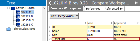 Consider the following example data, and assume that Overwrite existing values is selected (as described above). Selecting the Source Workspace = Main will result in writing the T-shirt Size value of S, while selecting Source Workspace = Approved will write the XS value.
