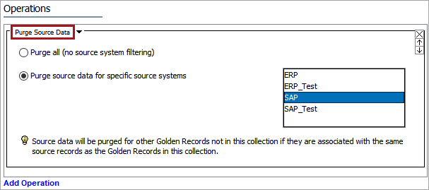 This operation allows Source Record Data for all sources or per source system to be purged for records with a current source system / record ID reference to the Golden Records.