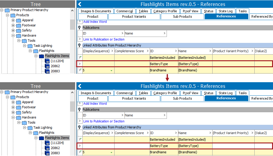 The following images show before and after the 'BatteryType' Add Attribute Link bulk update is run.