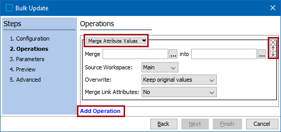 Specify the operations the bulk update should perform on the selected objects. When an existing configuration is selected, all saved operations are displayed.