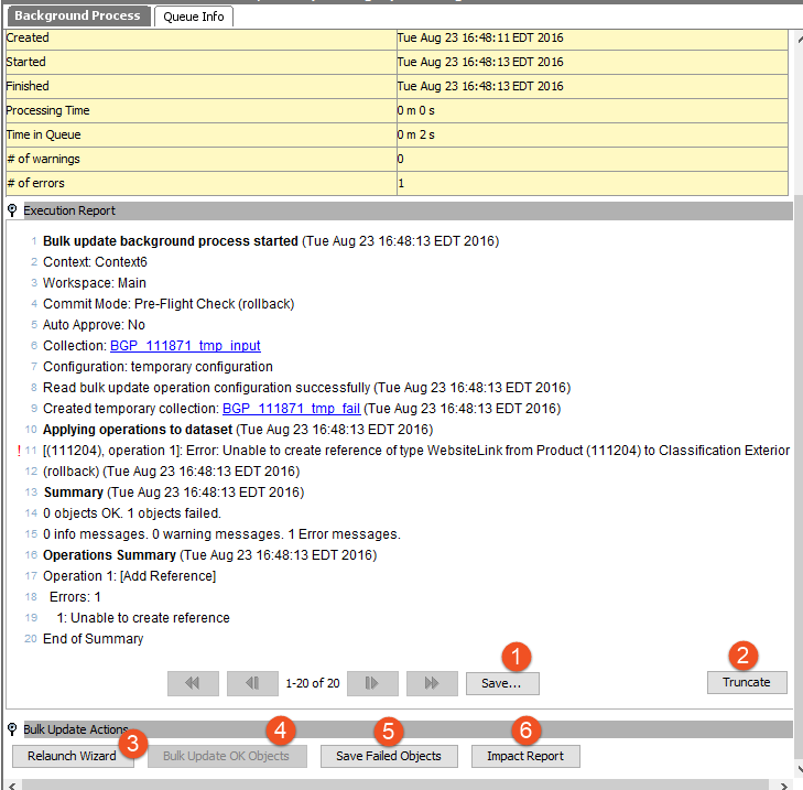 - Click Save Failed Objects to save the objects for which the bulk update failed as a new collection. Note that this option is only available if there were failed objects.
