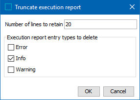 - Click Truncate if not all lines in the execution report are needed. Upon selecting Truncate, a dialog will appear allowing users to select which lines to delete, and how many lines to retain.