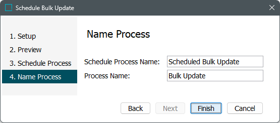Click Next to display Name Process and enter a name for the Schedule Process Name parameter. The Process Name parameter displays the name displayed in the Background Processes tab.