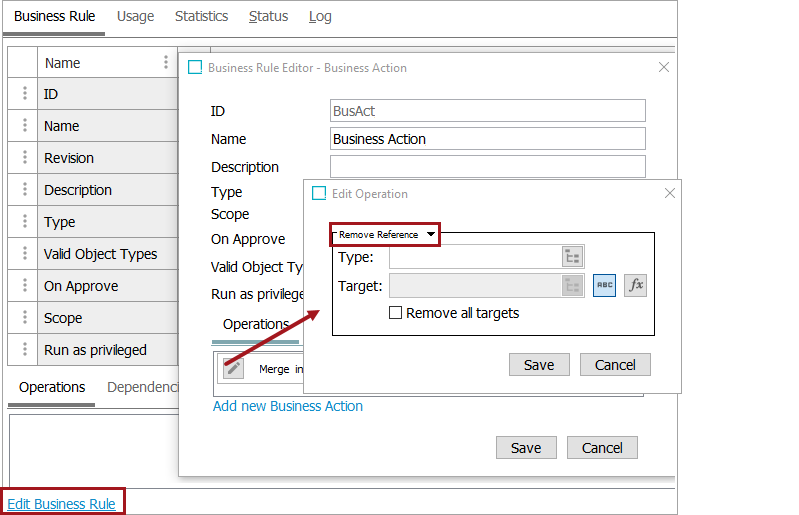 - On the Edit Operation dialog, from the dropdown select the References and Links group and then select the Remove Reference option.