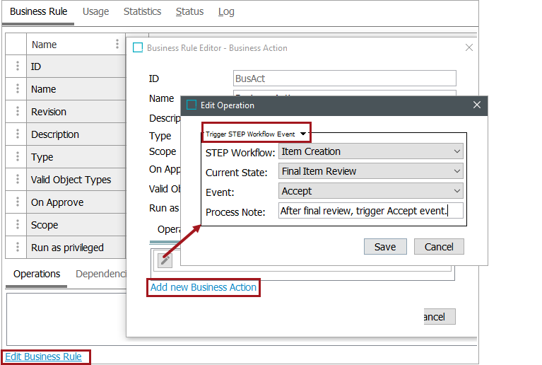 - On the Edit Operation dialog, from the dropdown select the Workflow group and then the Trigger STEP Workflow Event option.