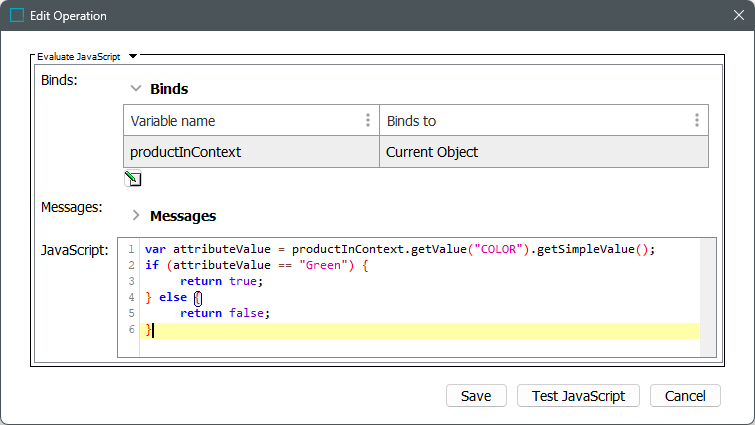 This binding creates the 'productInContext' variable, which represents the object that this business rule is processing and makes it available to the JavaScript code. Since the 'productInContext' variable is essentially a Java object, the code can read its parameters and invoke methods on the object. The available parameters and methods are documented in the Scripting API section of the Technical Documentation, available at [system]/sdk or accessible from the Start Page.