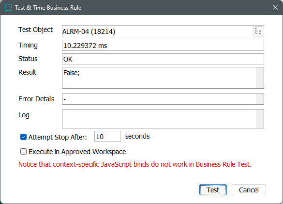 On the Test & Time Business Rule dialog (shown below), select a test object (the object to run the business condition against) and click the Test button.