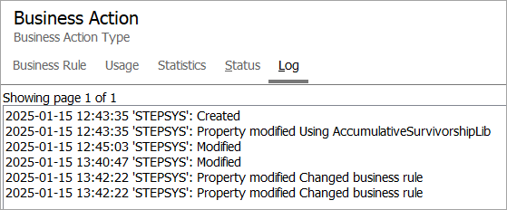 The Status tab provides an overview of the revisions of the business rule, including the user who changed the object and when the change occurred. Previous versions of business rules can be viewed as read-only by clicking the eye icon for the rule.