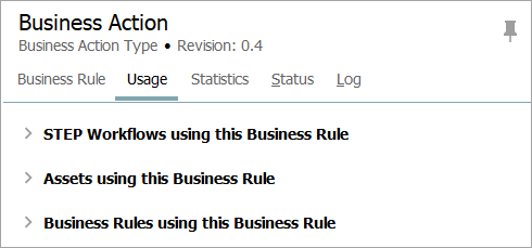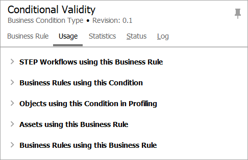 The Usage tab displays information about where the business rule is used. The available flippers are determined by the type of business rule displayed, as shown in the following images.