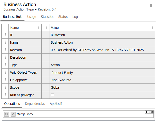 - Run as privileged: Business rules are generally tested and executed with the privileges of the user who triggers the test or execution. This could be a user who approves an object or imports data into STEP. As a business rule designer however, often an action should happen or a test should be performed independent of the user who triggers the condition or action. This is accomplished via the 'Run as Privileged' parameter on the Business Rule editor. When this checkbox is selected, the Action or Condition will be executed or tested with global read / write privileges.