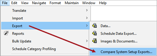 Go to File > Export > Compare System Setup Exports... to display the Compare System Setup Exports dialog.