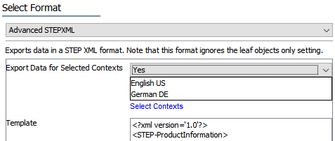 A STEPXML file can contain data from multiple contexts, and you can manually export data for multiple contexts with the STEPXML format and the Advanced STEPXML format.