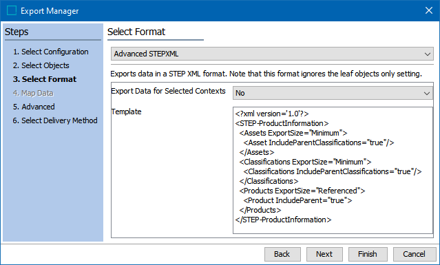 STEPXML can be exported from a STEP system via the Export Manager using either the 'STEPXML' or the 'Advanced STEPXML' format. Both options produce the same format but differ in how you configure the export, i.e., how you decide what data should be included in the exported file. The Advanced STEPXML format makes use of an XML 'output template' sometimes also referred to as a 'recorder file' while the STEPXML format allows for the export to be configured via a UI with a large number of drop-down menus with the selections that allow for behind-the-scenes mapping to an output template. The Advanced STEPXML option is generally harder to work with but offers greater flexibility in configuring the export.