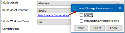<?xml version='1.0'?> <STEP-ProductInformation> <Assets ExportSize="Minimum"> <Asset> <AssetContent ExportType="Binary"> <ImageConversionConfiguration ID="Source"/> </AssetContent> <!-- other asset specific instructions omitted -> </Asset> </Assets> <!-- other instructions omitted -> </STEP-ProductInformation>