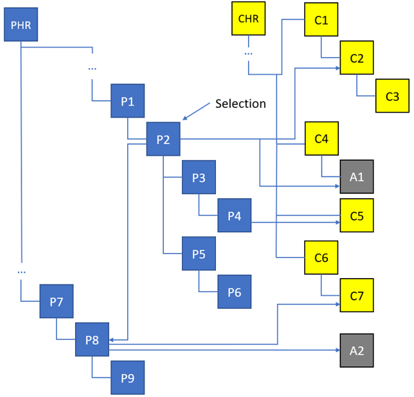 With this output template, P1, P7, C1, and C4 and all ancestor nodes up to ‘Product hierarchy root’ (‘PHR’ in the diagram) and ‘Classification 1 root’ (‘CHR’ in the diagram), that both always exist on a STEP system, are included in the exported file. This allows importing the file on a system where the ancestor nodes do not exist in advance. This is illustrated below with non-exported nodes dimmed: