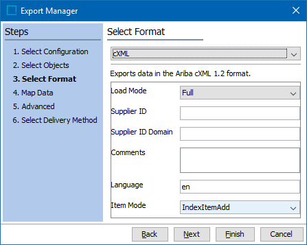 The cXML format exports data using Ariba cXML 1.2 and is an XML-based language designed specifically for communication of e-commerce business documents. For more information, search the web.