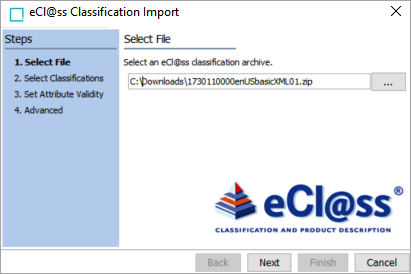 The ECLASS classification data is delivered in a .ZIP file, where the file name indicates the version. The import wizard uses a background process to create attributes (if necessary), and classification folders that include the version number. This allows you to access multiple versions of ECLASS within the same system.