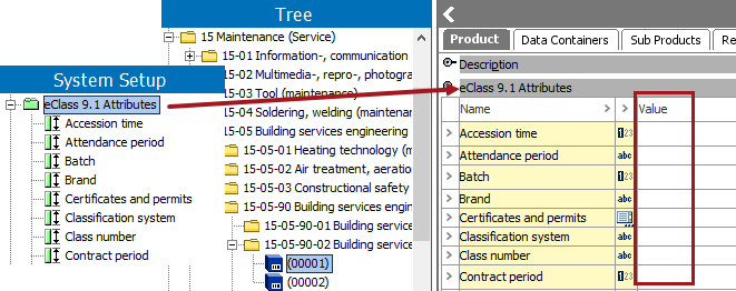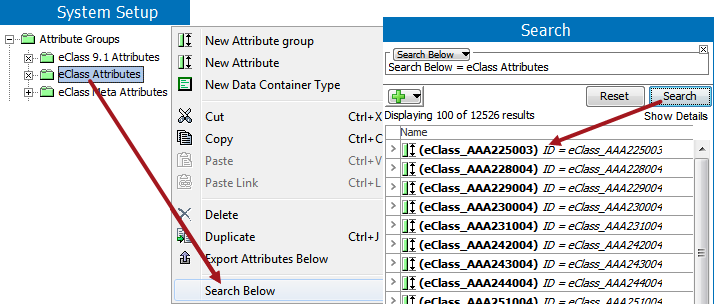 - eClass [version number] Attributes - specification attributes applicable to the named version. When multiple ECLASS versions are imported, multiple eClass [version number] Attributes groups are created.