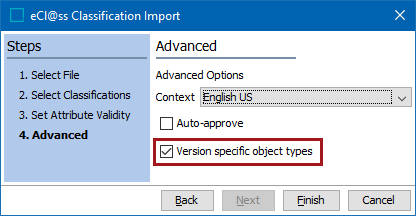 To create a version-specific object type structure, select 'Version specific object types' on the Advanced step of the ECLASS Classification Importer.