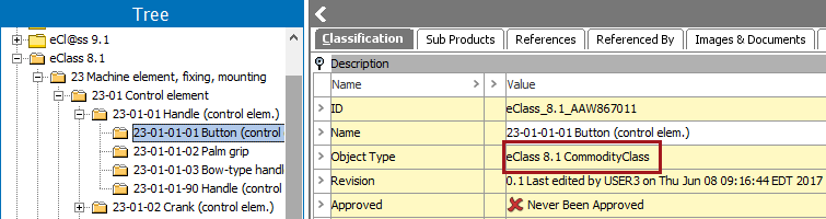 In STEP, ECLASS classifications are linked to objects (materials, products, and/or services) via a 'product-to-classification link type' reference type. This displays objects within the ECLASS folder as shown in the image below.
